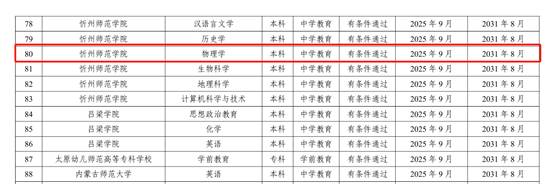 2024年5月,山西省教育厅、教育科学研究院组织师范专业认证专家组,对物理系物理学专业的教育教学情况开展了全面、细致的入校现场考查。2025年9月,教育部正式发布通知,确认忻州师范学院物理学专业“有条件通过”普通高等学校师范类专业第二级认证,认证结论有效期为六年。这一认证结果不仅是对物理学专业长期以来坚持师范教育初心、深耕人才培养工作的充分肯定,更是对该专业未来六年持续优化课程体系、提升教学质量、强化师范特色的有力鞭策。未来,物理学专业将以此次认证为契机,对照认证标准持续改进,进一步巩固专业优势,培养更多符合新时代基础教育需求的高素质物理教师。